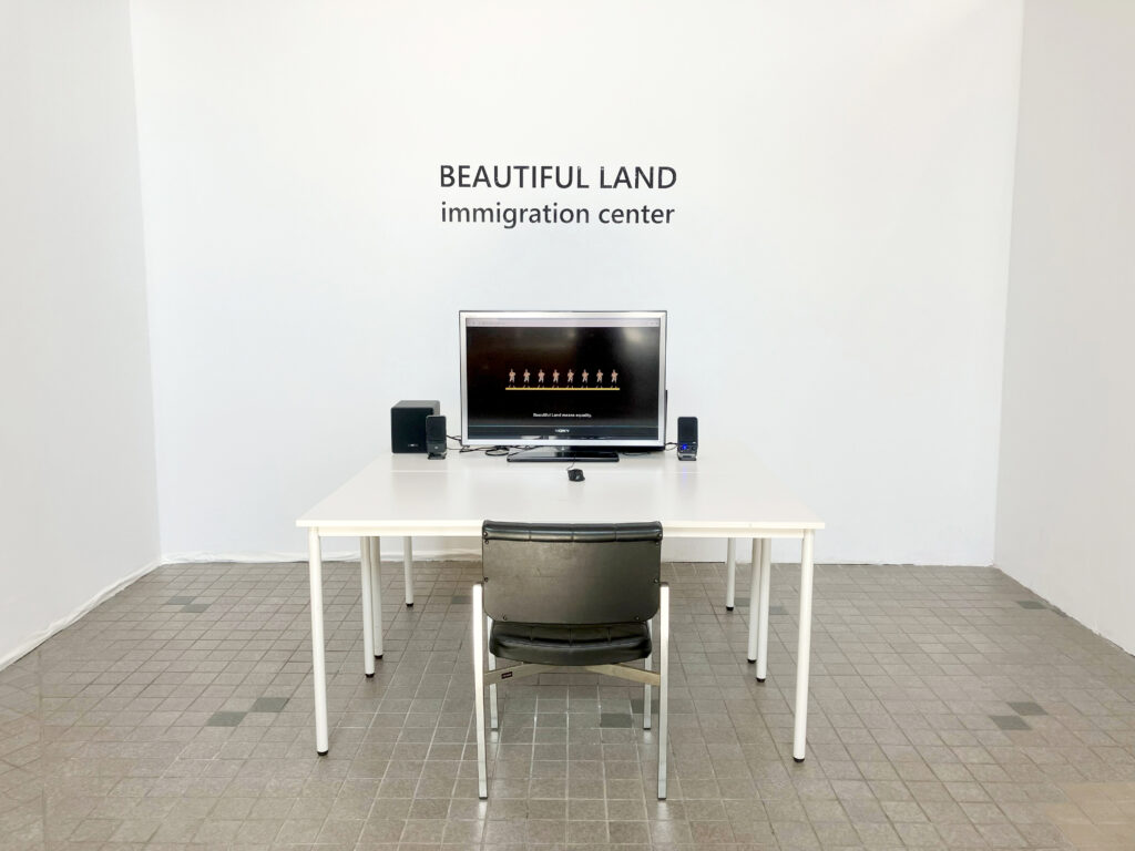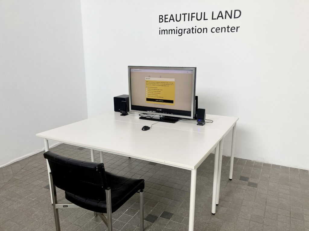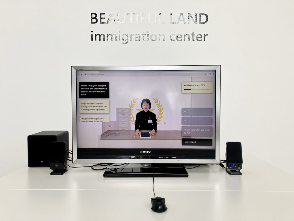 Beautiful Land is a virtual immigration checkpoint where visitors become applicants to a fictional state. Each applicant is assigned a profile at the outset and locked into a forward-only sequence: they navigate an interface where retreat, revision, or exit is impossible. In this space, agency is an illusion. While applicants encounter questions, their responses are never truly theirs. Instead, behaviors like hesitation, attitude, and emotional cues steer the system as it constructs and determines entry or denial.